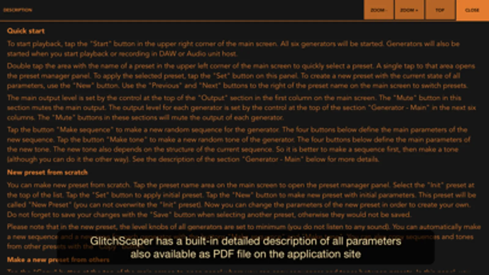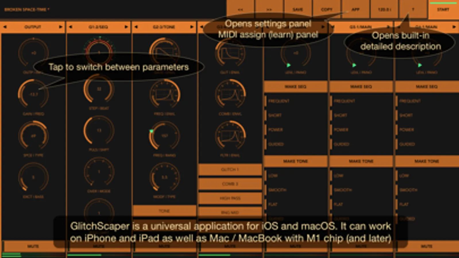GlitchScaper is a universal application for iOS and macOS. It can work on iPhone and iPad as well as Mac / MacBook with M1 chip (and later). GlitchScaper works on iPhone and iPad standalone, as an Audio Unit or Inter-App Audio module, and supports Audiobus and Ableton Link. On MacOS, GlitchScaper can works both as a standalone application and as an Audio unit (AUv3) with DAWs and audio unit hosts like Ableton Live, Logic Pro, GarageBand, MainStage, Cockos Reaper, Plogue Bidule, Hosting AU, and other hosts that support AUv3 plugins. All application features are available on iOS and macOS, including MIDI support (with a MIDI learn option) and audio unit parameters. GlitchScaper has a built-in detailed description of all parameters also available as PDF file on the application site.