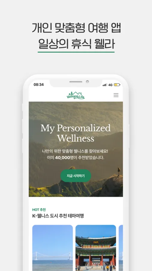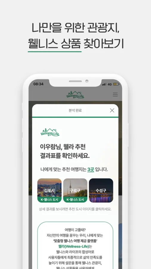 웰니스 관광지, 웰니스 상품들을 사용자에게 매칭해주는 맞춤형 플랫폼 입니다.