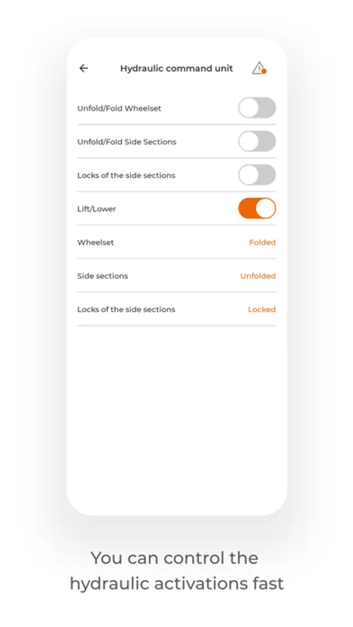 • Hydraulic command: Activate each hydraulic activation connected to the implement, such as the lift and lower equipment, unfold and fold the wheelsets and sides, and lock and unlock the sides.