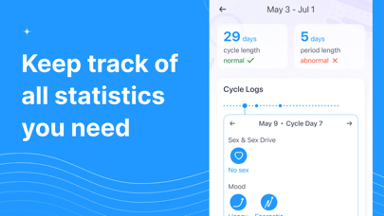 Check your stress level, average period dates, dynamic of cycles length, cycles history . For every period we have detailed statistics about your symptoms, weight change, water intake and deviation from periods norms.