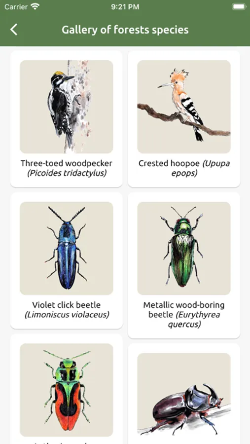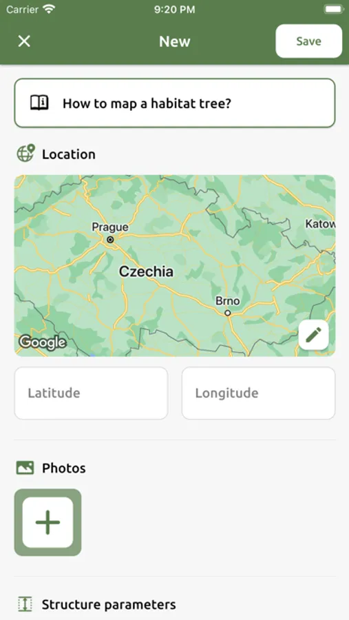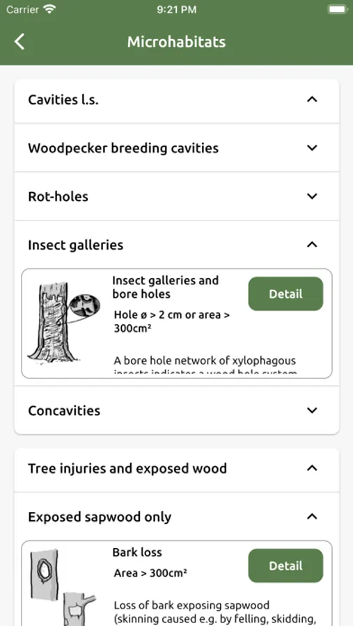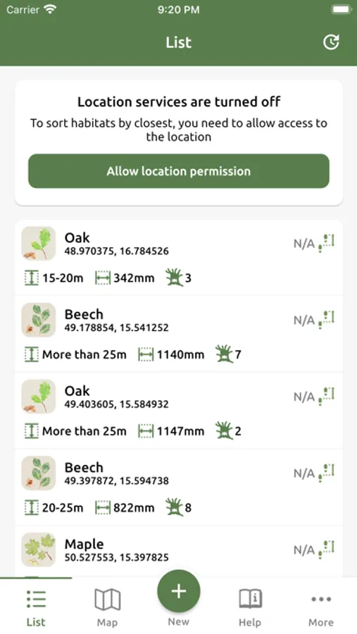 The Lesodiversita application allows both registered and unregistered users to map habitat trees and thus contribute towards the habitat tree database creation. When saving a habitat tree, the application requires the user to determine the GPS position of the tree, take or insert a photo(s) of it, record its thickness, height, species as well as to fill in the so-called microhabitats that occur on the habitat tree. Microhabitats are, for example, cavities, cracks, fungi, lichens, dead parts of the crown or flowing sap. The complete database of microhabitats, which is used by scientists, is part of the application. The application also includes a gallery of forest species of organisms that use the habitat trees during certain stages of their lives. This gallery will be continuously updated. The habitat trees database can display individual habitat trees within the database with all their parameters. The application database is also connected to the web portal, which provides the user with additional functions and information related to this project.