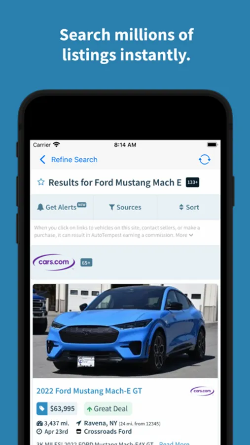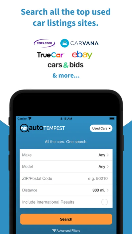 A: AutoTempest pulls together listings from many of the top car listings sites, including Cars.com, Truecar, Carvana, eBay, and many more. That said, there are a few whose listings we don't have direct access to. However, to make your search as easy as possible, we do still link to matching search results from those sites. So you actually can see all their listings matching your search; just click the comparison links at the end of our results. No need to visit multiple sites (or apps) and re-enter your search.