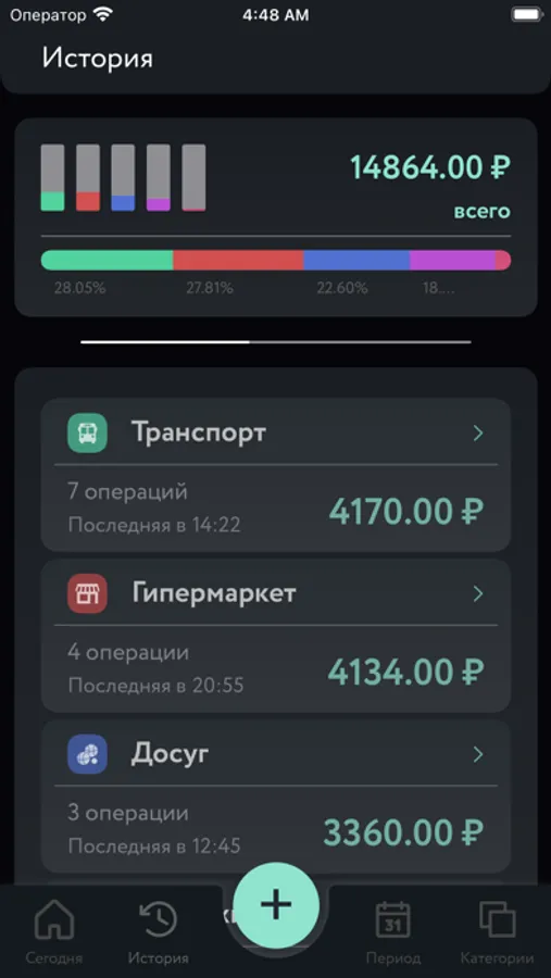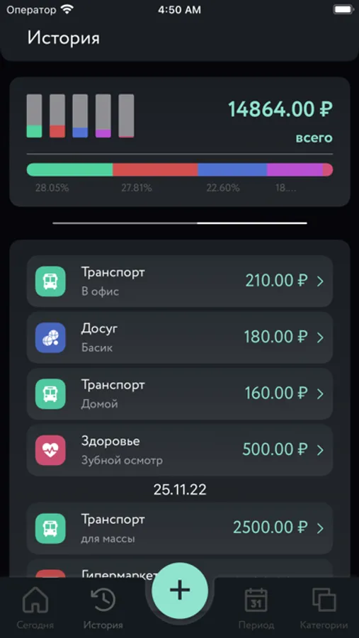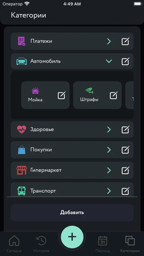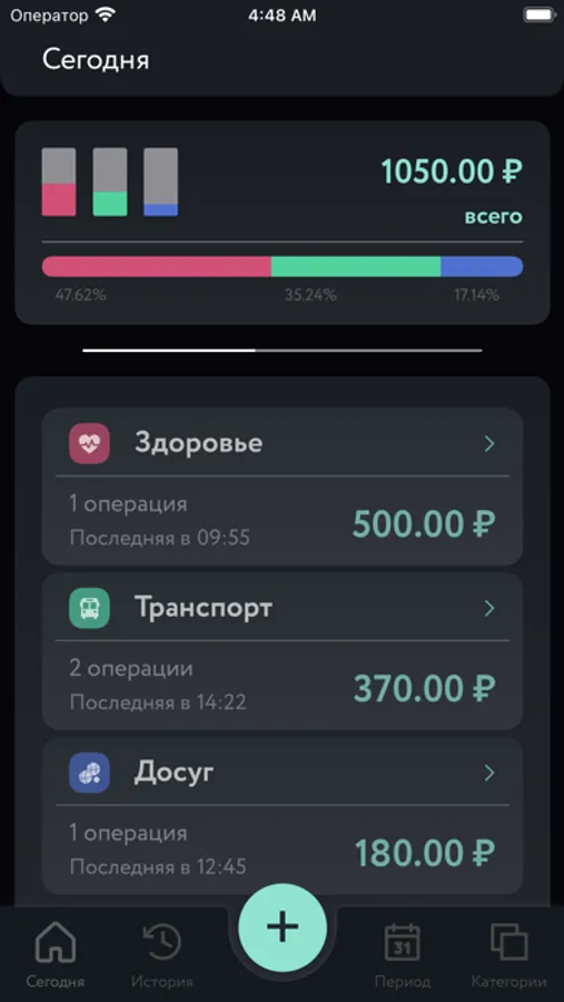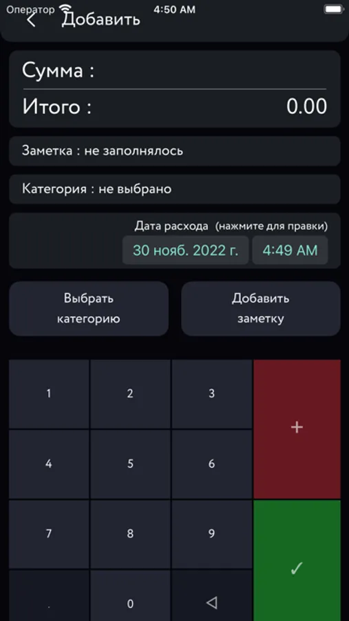 Просто нажмите на добавления расхода и введите сумму, настроить можно и потом. Расход автоматически попадает в категорию прочее, а после, когда будет удобно, Вы можете добавить описание, отредактировать дату, выбрать категорию. Редактирование и просмотр доступны в любом месте приложения по нажатию на расход.