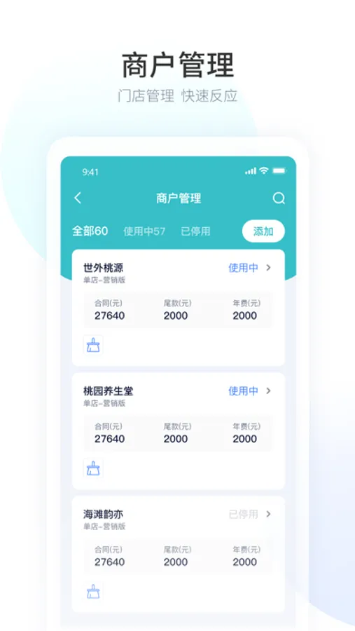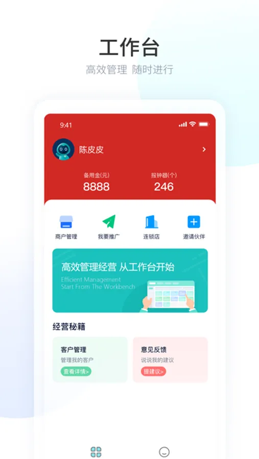 2.系统功能包含:商户管理,营销推广,客户管理,伙伴管理,财务统计等主要功能