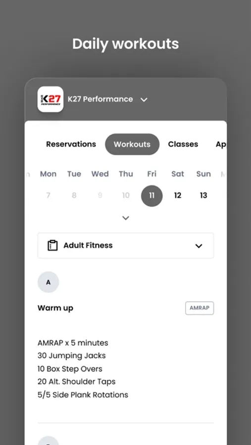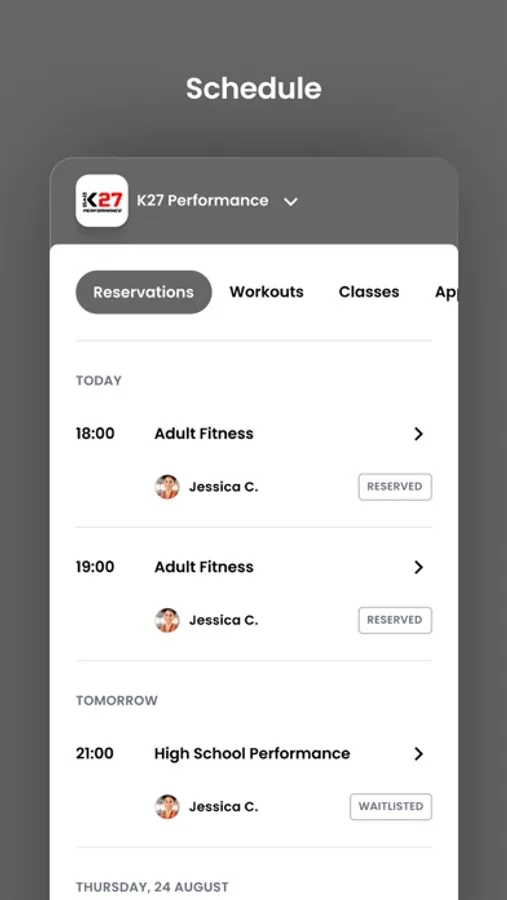 For members of K27 Performance to reserve their place in a class, sign up for gym events, and general account management like updating headshots and credit card on file.