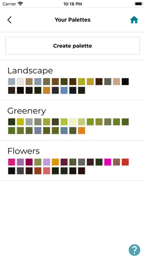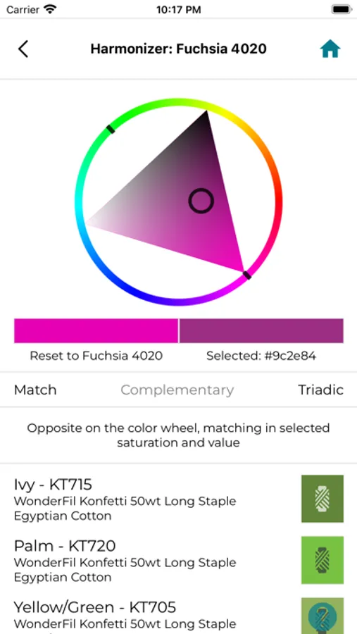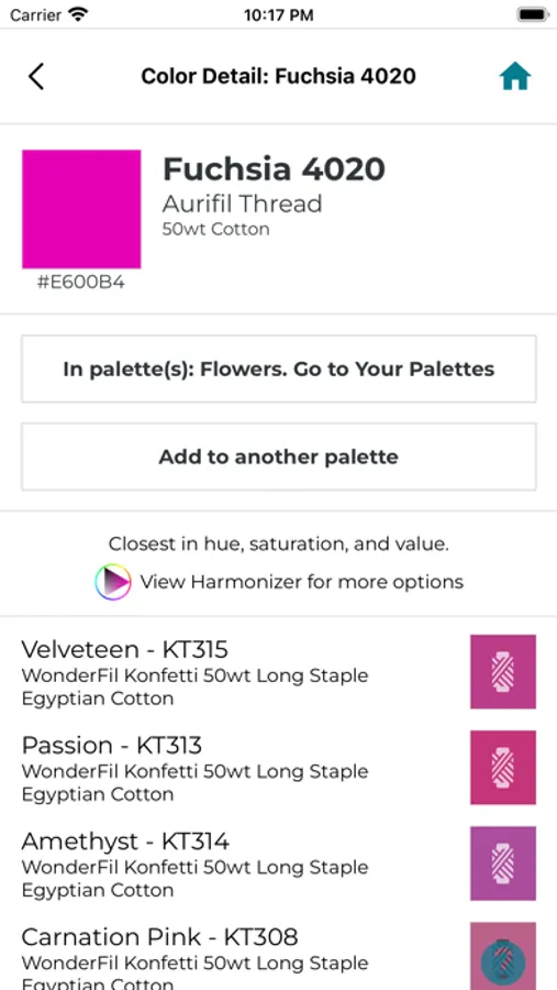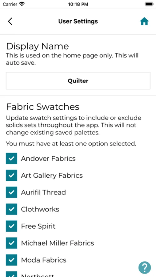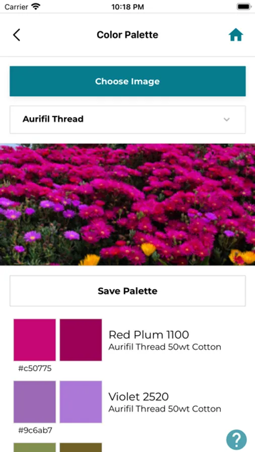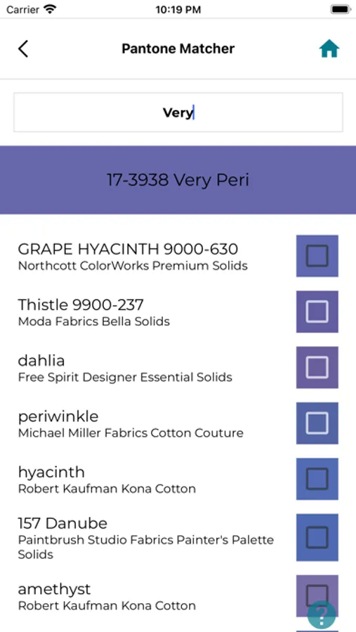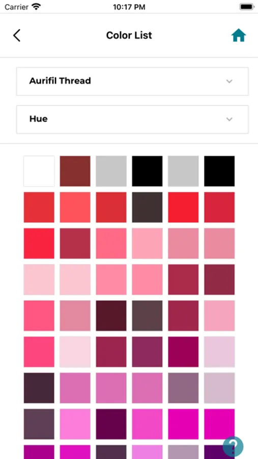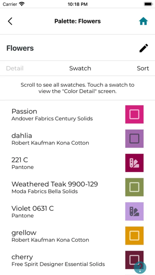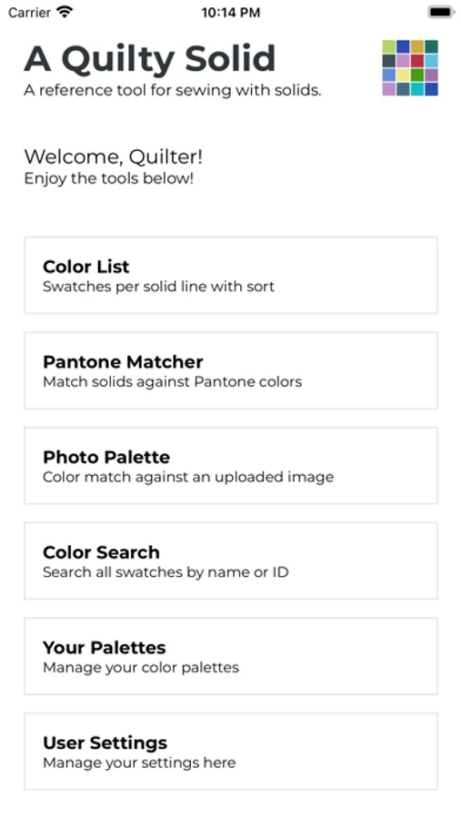 A Quilty Solid provides a reference for quilting solids colors. It includes representations of solids from multiple manufacturers including Art Gallery, Kaufman Kona, Aurifil thread, and more. The tools include a color reference list with sortable swatches, color detail with harmony interactions, a Pantone color matcher that provides color matching against Pantone colors, a palette building and randomizer tool, and a swatch matcher against an uploaded photo. Help for each tool is provided on an additional screen. User settings can control which solids lines are included in the app.