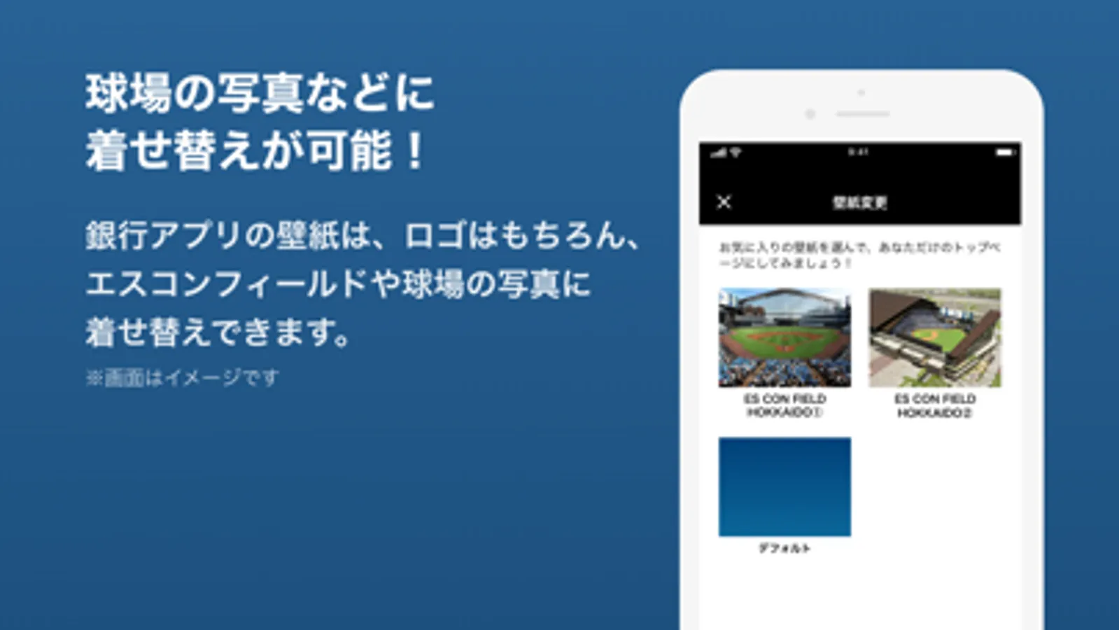◆銀行アプリの壁紙は、ロゴはもちろん、エスコンフィールドHOKKAIDOの写真に着せ替えできます。