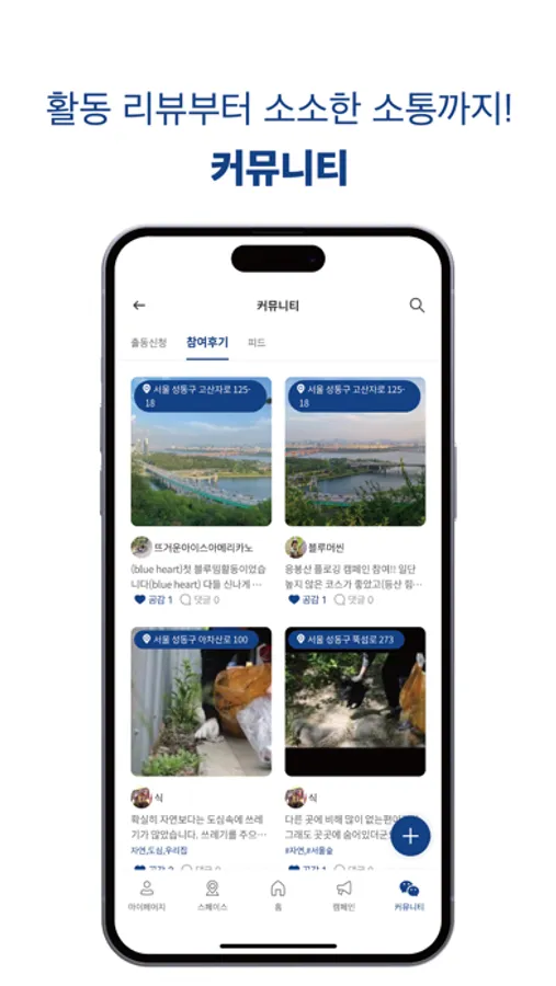 캠페인이 필요한 장소에 블루머들의 출동을 신청할 수 있어요. 나만 알고 있는 환경 활동 장소를 공유해 주세요.