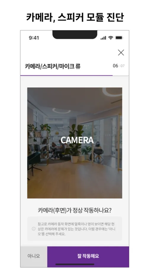 * 성능검사를 위해 카메라, 스피커/마이크, 위치정보, 와이파이, 블루투스, 사진 등 접근권한이 필요합니다.