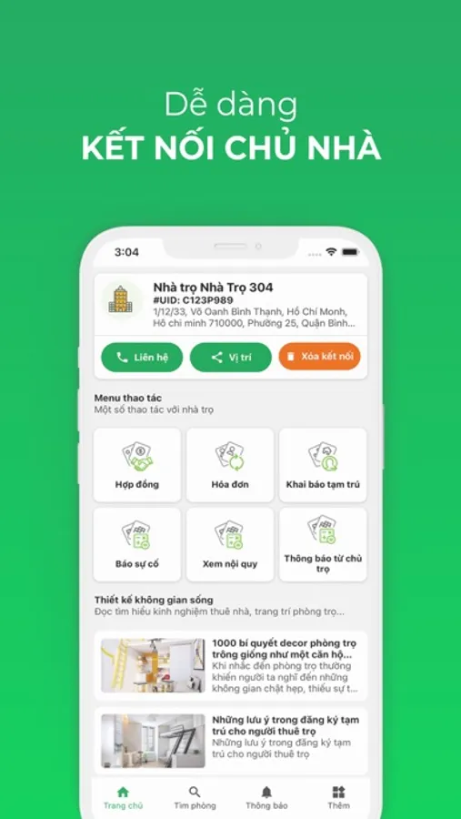 - Kết nối khách thuê và chủ trọ: Ứng dụng giúp người thuê và người cho thuê nhà trọ “tìm thấy nhau”. Bên cạnh đó, trong quá trình cho thuê phòng trọ, đây còn là phần mềm hữu ích giúp lưu trữ hợp đồng cho thuê, hiển thị hóa đơn thu tiền, báo cáo sự cố khi cần,...