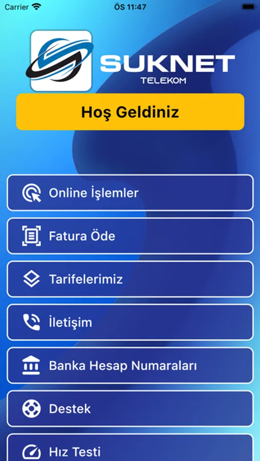 Suknet Telekom Mobil uygulaması ile telekomünikasyon işlemlerinize kolaylıkla erişebilirsiniz. Fatura ödemesi, Hız Testi, Kolay iletişim gibi pek çok seçeneği kolaylıkla kullanmak mümkün.