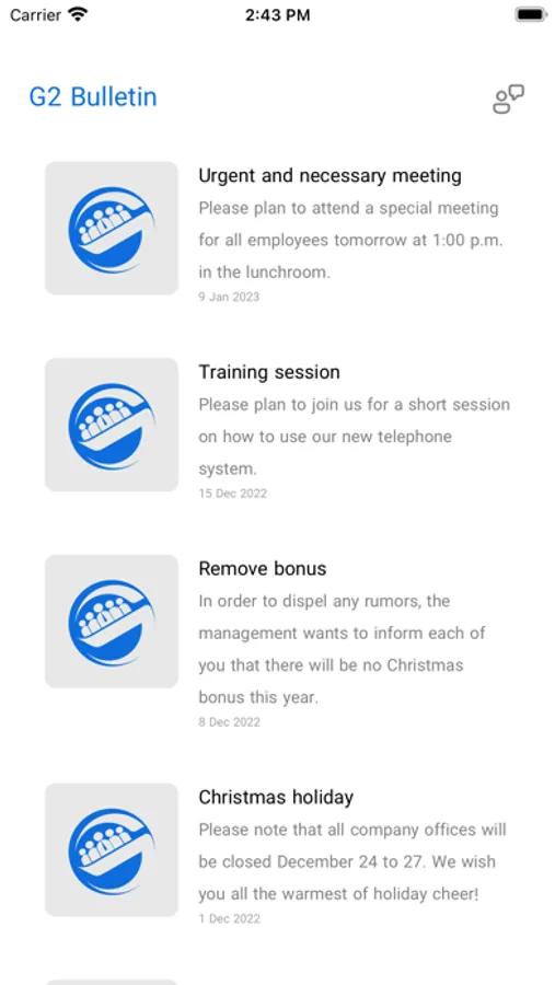 G2 Bulletin is an in-house application that you can easily use to get information about your company announcements. With the help of G2 Bulletin, you can publish your company's important internal news.