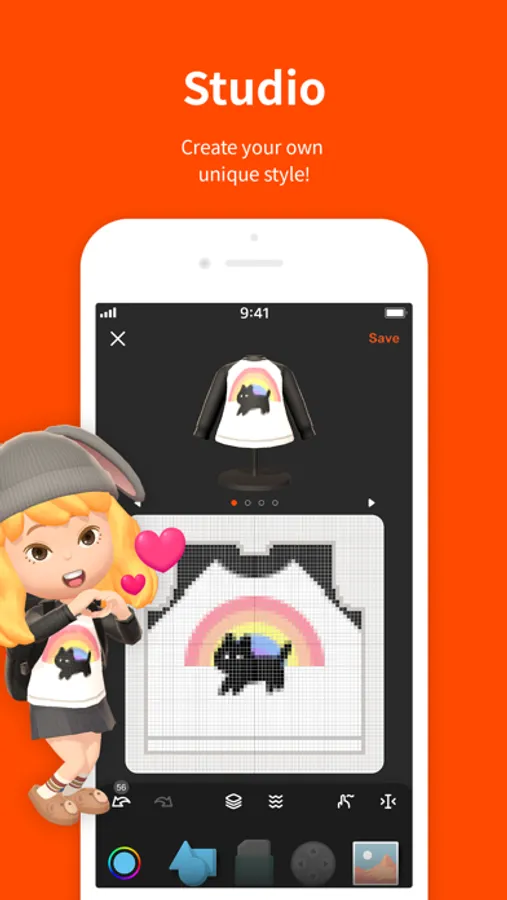 • Bring your style to life by dressing up your avatar with your own custom-made outfits.