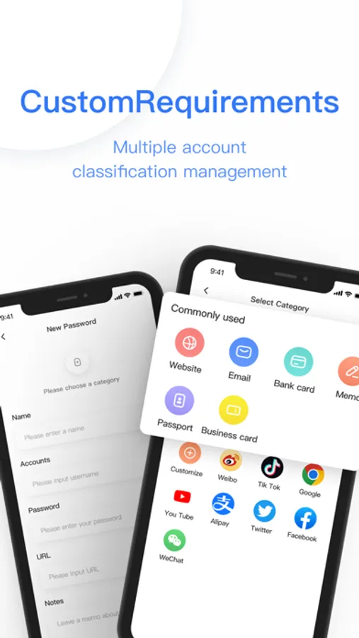 3. Classification management: intelligent management of account passwords, bank accounts, identity information, security notes, etc.;