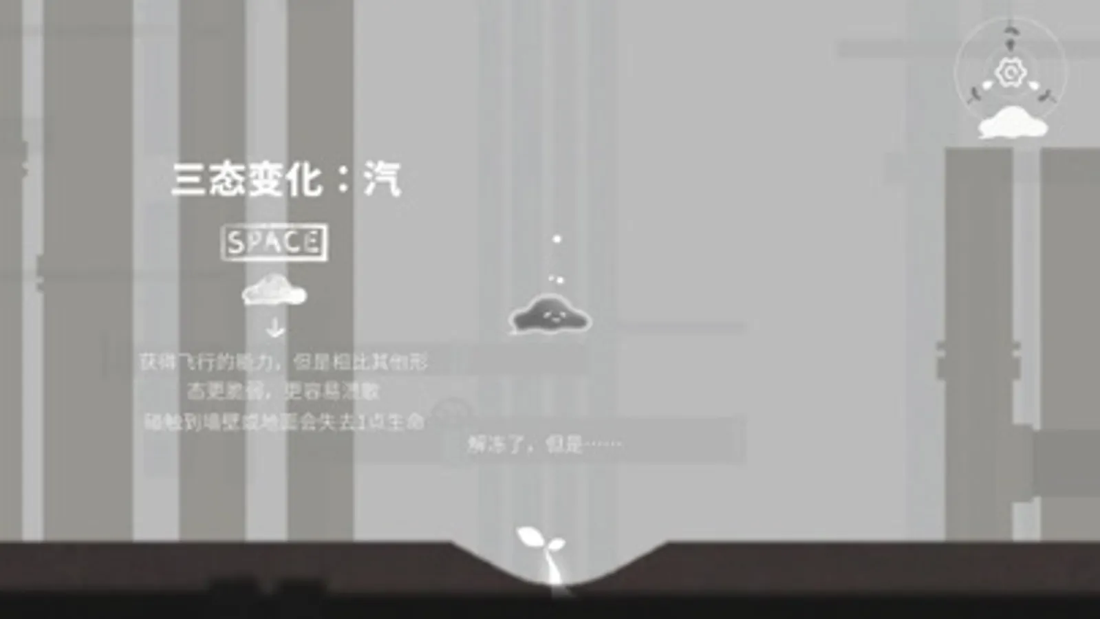 这是一款2D横版跳跃解谜游戏。在游戏中你将扮演一颗小水滴,你需要躲避各种危险,不断前进完成你的冒险,最终抵达目的地。在你的冒险过程中,你将获得转化为固体形态与气体形态的能力。每种形态有各自不同的特点,你需要灵活转换你的形态来应对不同的困难。