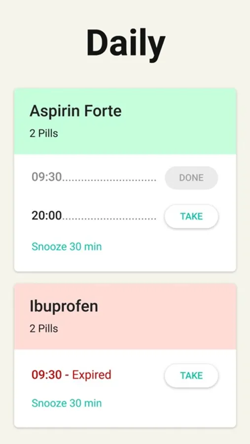 In the app, you can set up several reminders, as well as various types of medication such as tablets, pills, drops, injections, etc.