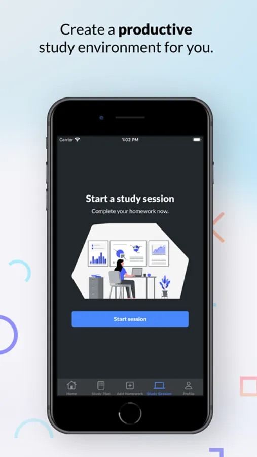 - Start a study session when you want to complete your homeworks. You can choose between various lengths: 15 minutes, 30 minutes, 45 minutes or 60 minutes. Create a productive study place for you. Remove any distractions and use our focus timer to complete your school work.