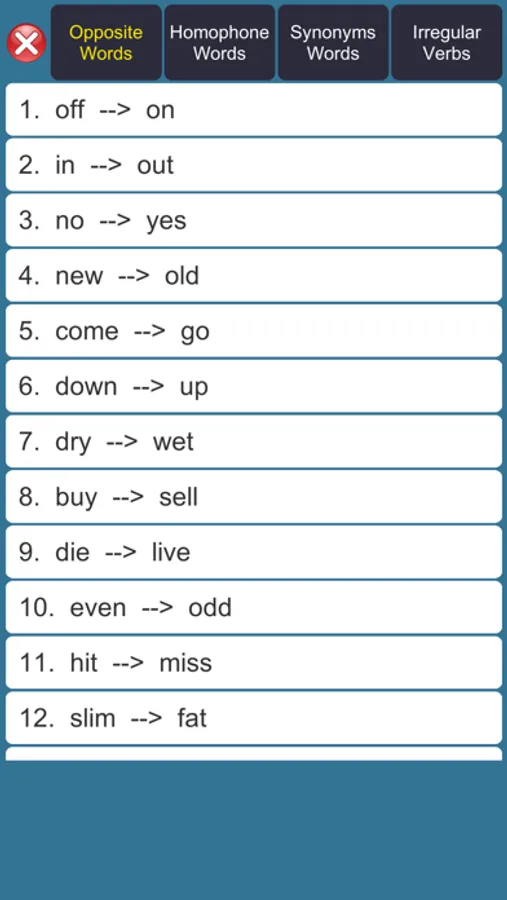 Learn Opposite, Homophones, Irregular Verbs and Synonyms Words.