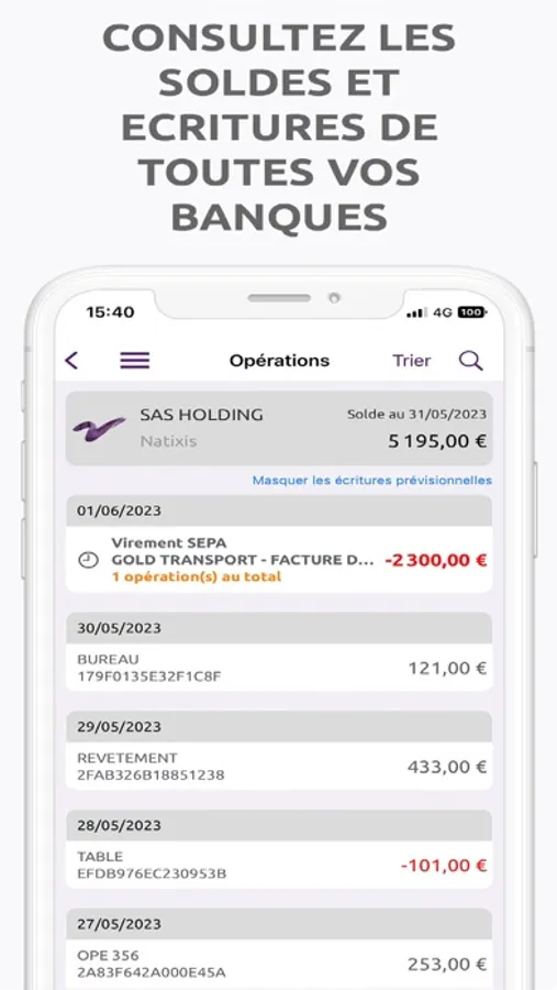 - Consultez les soldes et écritures de l’ensemble de vos comptes dans toutes vos banques gérées dans votre logiciel « Suite Entreprise »