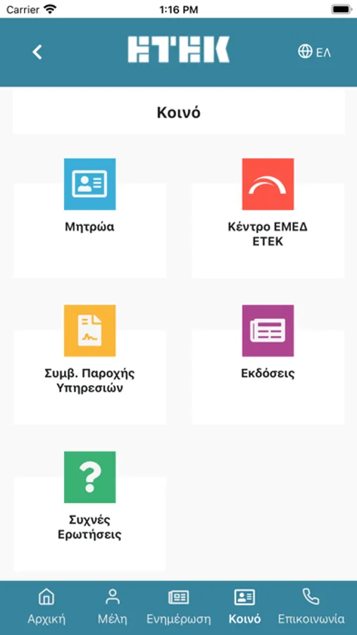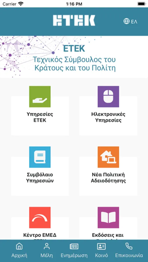 H εφαρμογή του ΕΤΕΚ για κινητά «ETEK Mobile App» περιλαμβάνει πληροφόρηση για νέα, εκδηλώσεις, άρθρα και εκδόσεις καθώς και για ανακοινώσεις, παρεμβάσεις και δράσεις του ΕΤΕΚ για τεχνικά θέματα που απασχολούν την επιστημονική κοινότητα και την κοινωνία ευρύτερα. Η εφαρμογή περιλαμβάνει επίσης πληροφόρηση για Υπηρεσίες που παρέχει το ΕΤΕΚ στα μέλη του και τους πολίτες καθώς και πρόσβαση στις Ηλεκτρονικές Υπηρεσίες του ΕΤΕΚ.