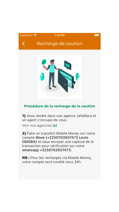 Recevoir un paiement : L’application Jevebara permet à tous les Grouilleurs de retirer leurs gains via Orange Money, Mobile money ou Wave money.