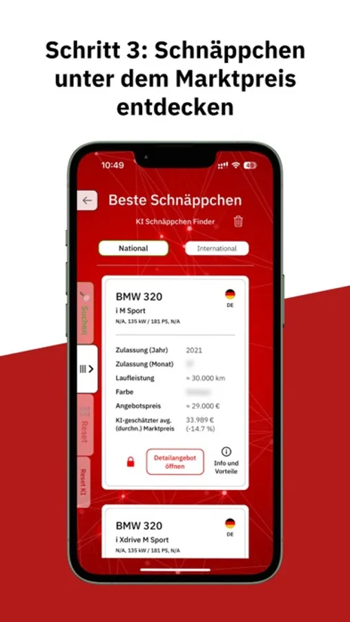 No more tedious searching through thousands of listings and countless filtering and sorting options, which are also interrupted by advertisements and paid ads, without clearly displaying the best price / quality bargains. Our AI does this hard evaluation work for you and presents you with an intelligently filtered and focused short list of the best deals below market price.