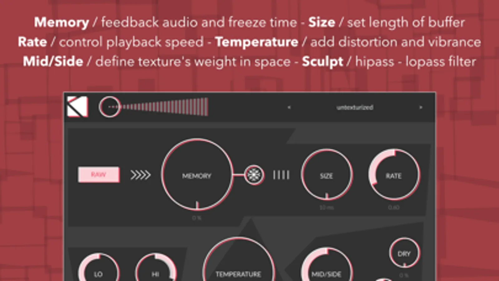 Several parameters let user sculpt the texture: an EQ section, a Temperature knob (a specifically designed distortion adds a noise-based amplitude modulation on higher values), and a Mid/Side knob to handle its weight in space.