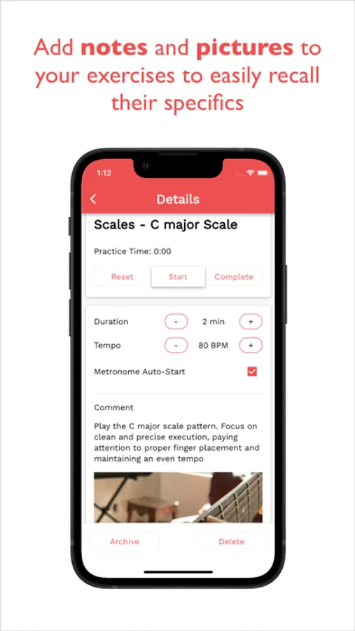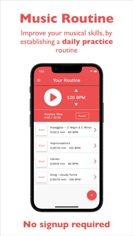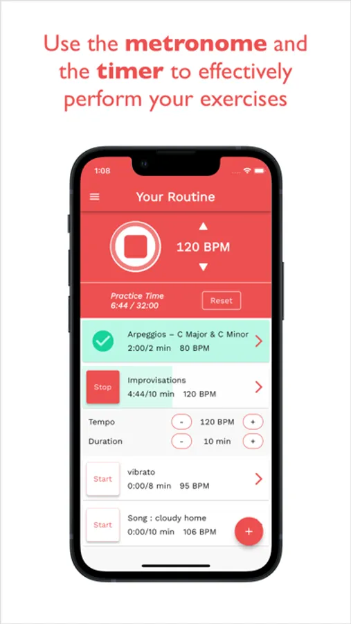 If you're serious about improving your instrument skills, establishing a daily practice routine is essential. With MusicRoutine you can create a personalized list of exercises and specify duration and speed for each of them. You can also add notes and pictures to make your routine more engaging and effective. Once created, play your routine with the built-in metronome and track your progress. Whether you play piano, guitar, drums, saxophone or any other instrument, the application lets you create a routine to suit your needs.