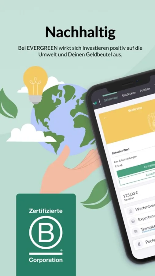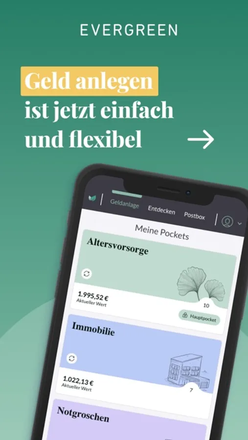 EVERGREEN ist der erste gebührenfreie und B-Corp zertifizierte digitale Vermögensverwalter Deutschlands. Wir bieten unseren Kundinnen und Kunden eine einfache und flexible Art der nachhaltigen Geldanlage. Mit Pockets, den digitalen Unterdepots, kann man ohne Zusatzkosten auf verschiedene Sparziele sparen. Unser Risikomanagementansatz schützt vor hohen Schwankungen der Geldanlage und sorgt gleichzeitig für einen stetigen Wertzuwachs. Wenn es an den Kapitalmärkten kritisch wird, reduziert unser erfahrenes Fondsmanagement-Team das Risiko im Portfolio und sorgt bei steigenden Märkten für Partizipation. Starte jetzt schon ab 1 Euro Anlagesumme.