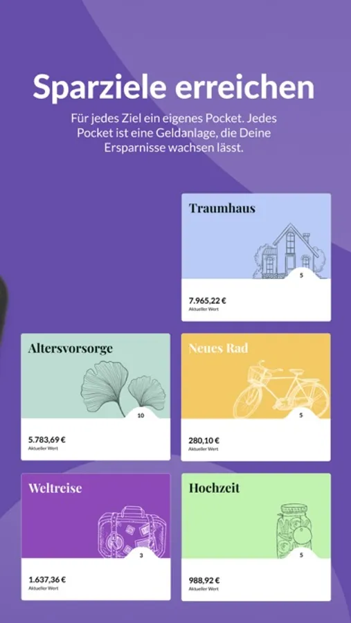 • Für jedes Sparziel kannst Du Dir ein eigenes Pocket (Unterdepot) einrichten und Dein Geld für Dich arbeiten lassen.