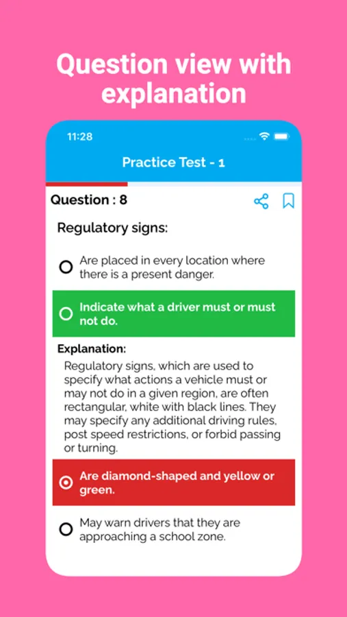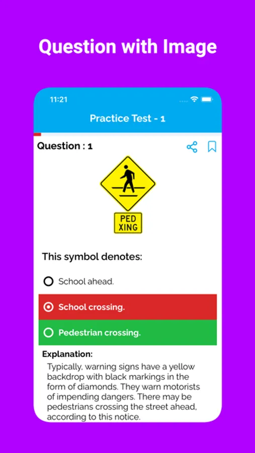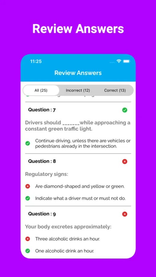 Our app includes a variety of practice questions for the Driver's license exam for Car, Motorcycle and Commercial Vehicles. These questions are based on the official handbook of different states.