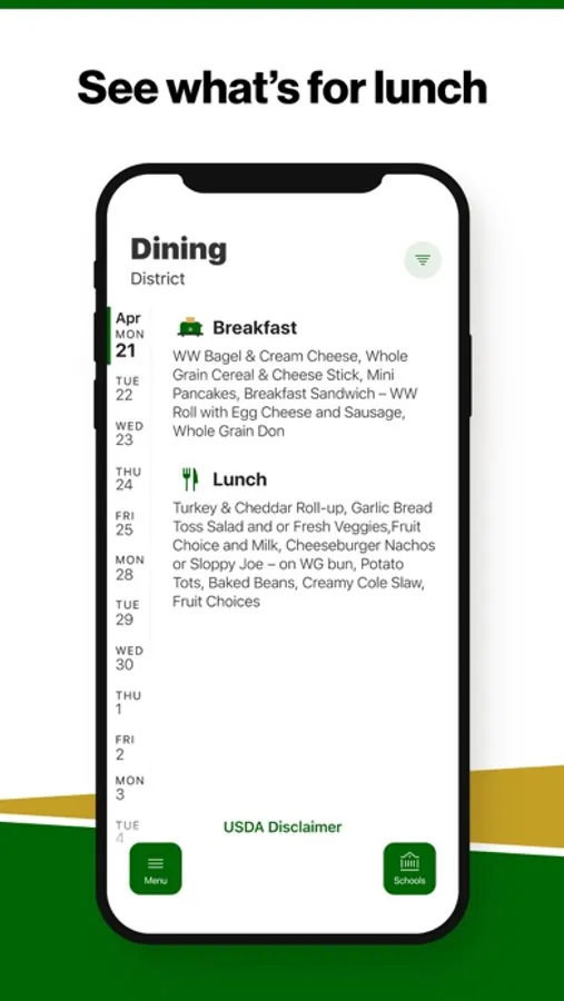 Within the dining section, you'll find an easy to navigate, weekly menu, sorted by day and meal type.
