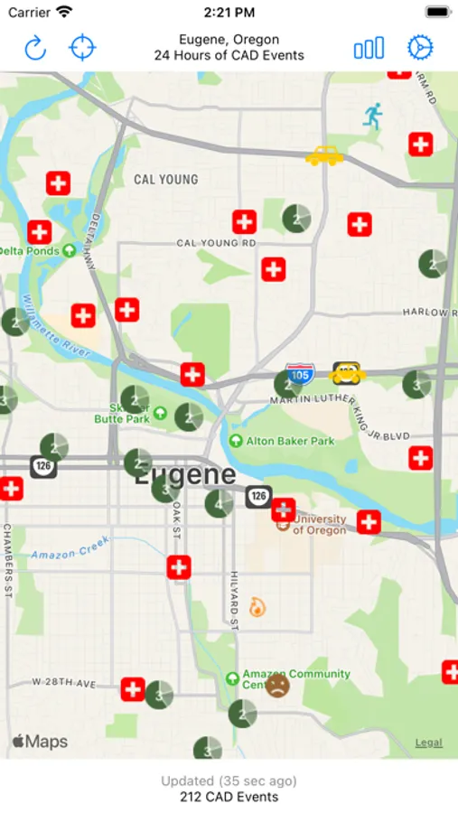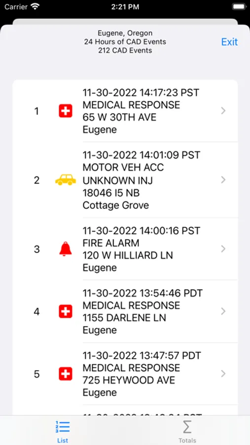 Monitor 24 hours of ambulance, emergency, fire and police events from Eugene, Oregon's Computer Aided Dispatch system. Filter events by distance, time and description.