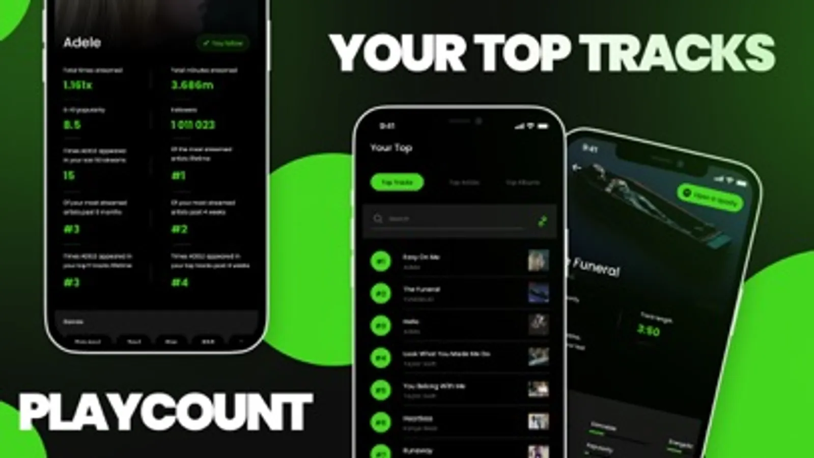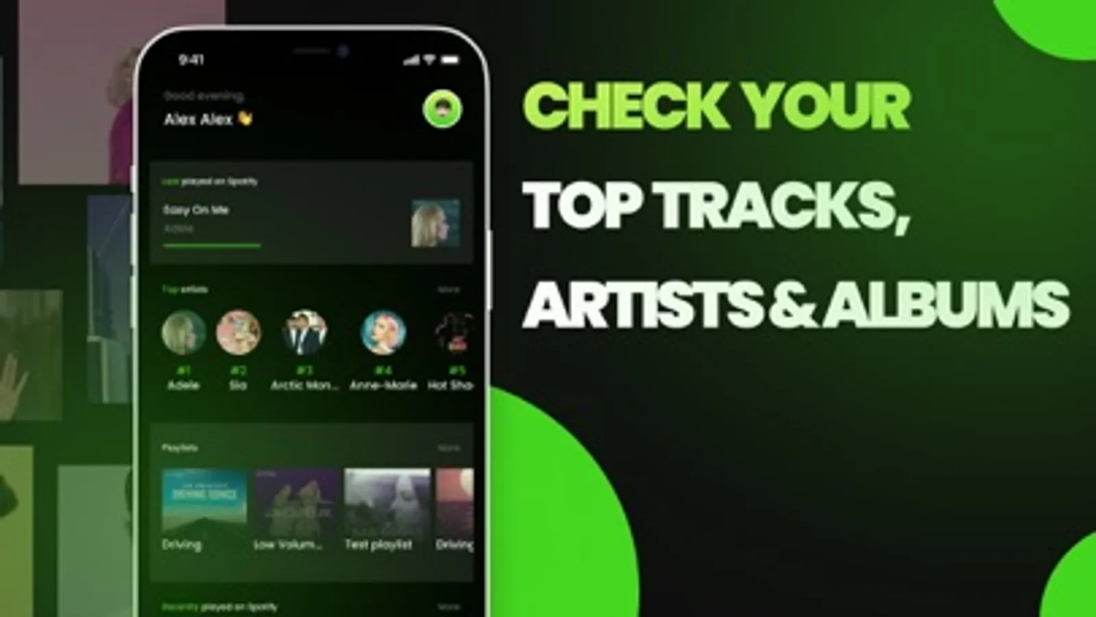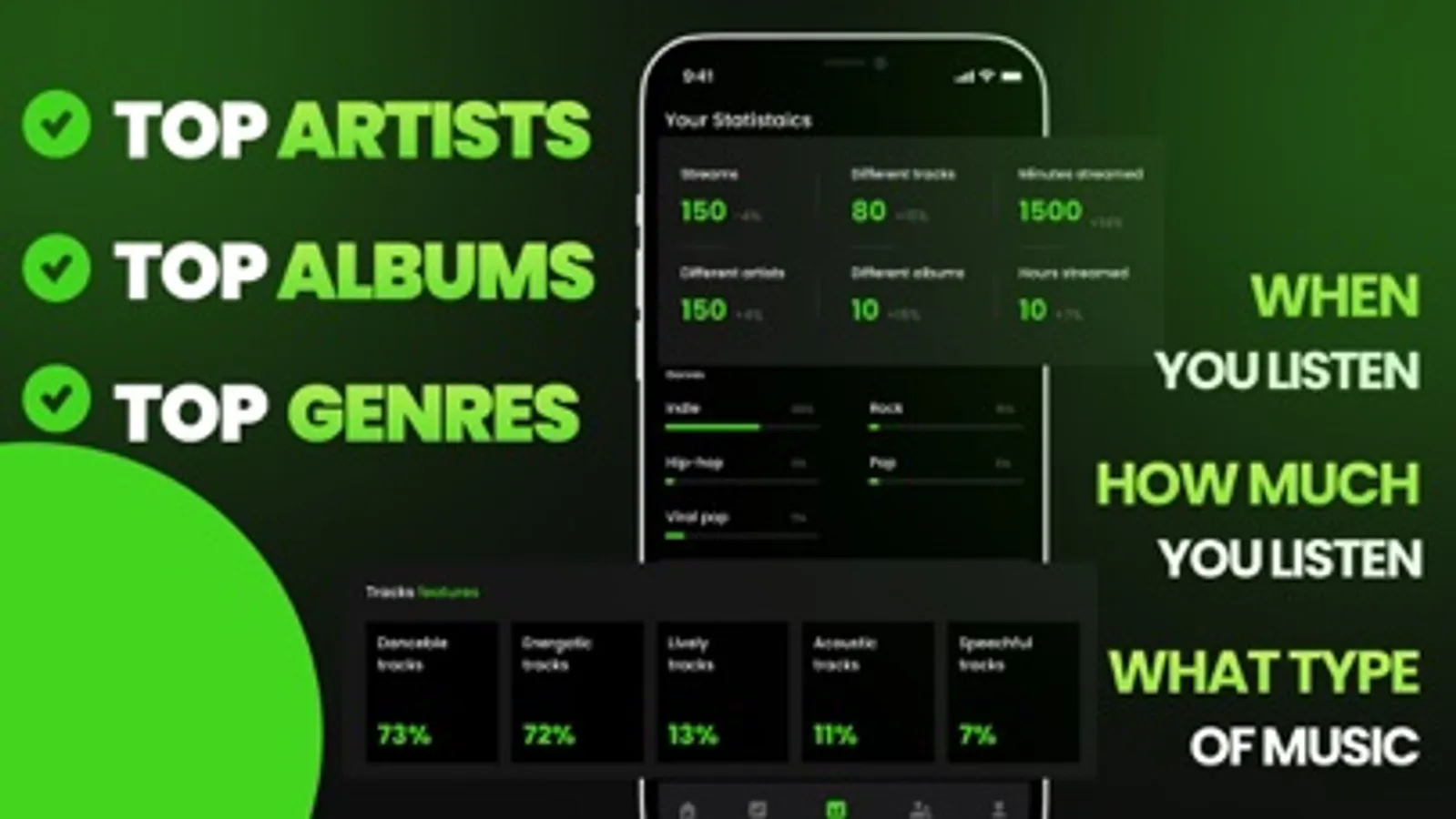 You can see the full statistics of your music in 1 tap. All you have to do is sign in with Spotify.