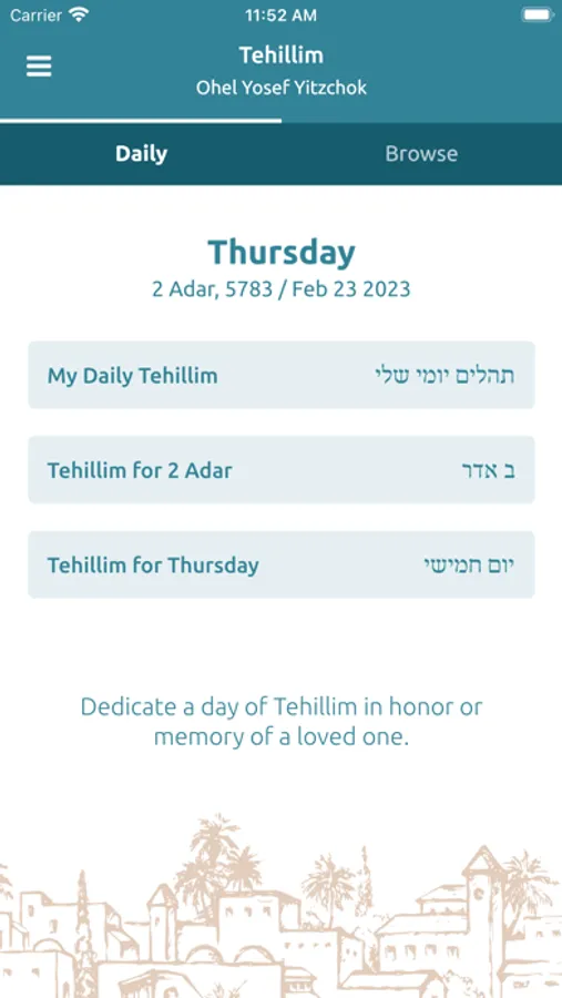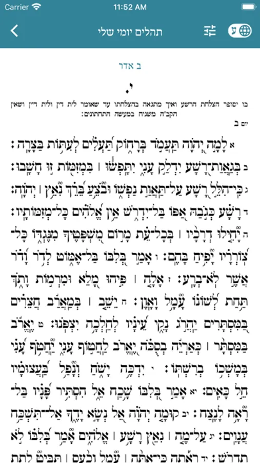 • Browse the Tehillim using preset shortcuts, including by chapter, book, day of the week and day of the month (you can select based on the Jewish and Civil calendars).