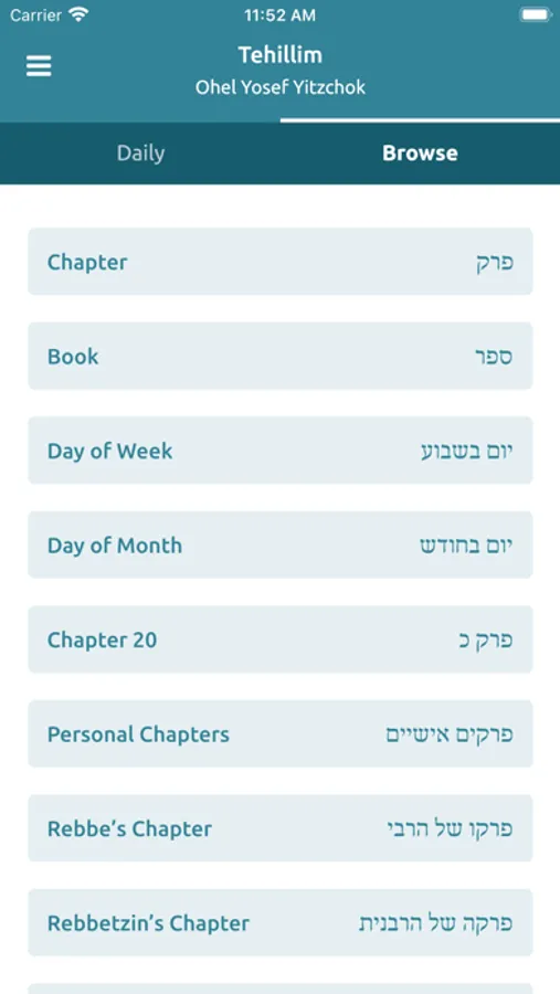 • My Daily Tehillim - personalize the app based on your daily Tehillim routine and in the order you like to say it. You can choose to display Tehillim for the day of the month or week. Opt to include Chapter 20 on days when Tachanun is not recited, include the 3 chapters recited during the months of Elul/Tishrei, as well as your own list of personal chapters.