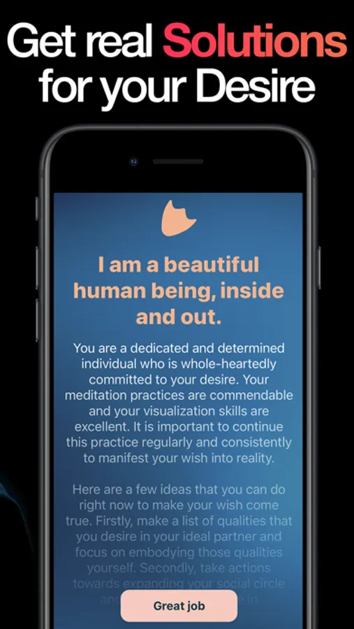 * Affirmation at the end of meditation to reinforce the experience (with over 10,000 affirmations, our AI will select the perfect affirmation tailored to you and your wish)