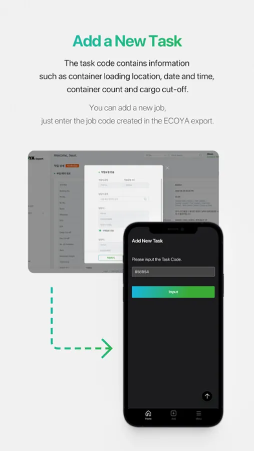 Type the task code you received to add a new task. Verify information such as container loading location, date and time, container count and cut-off time in the task details.