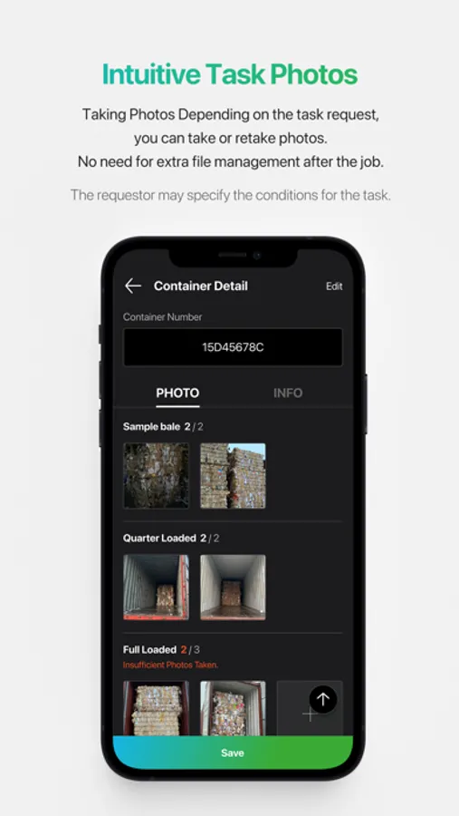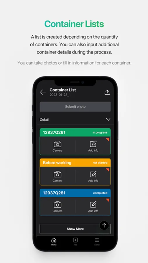 A list is created based on how many containers there are. You can take pictures of the container in sequence or several tasks and enter more information. You can easily verify the remaining container tasks and make sure there are no missing container tasks.