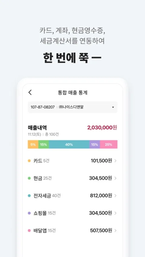 한번에 연동된 카드사의 승인 정보를 집계하여 실시간 매출을 확인할 수 있어요
