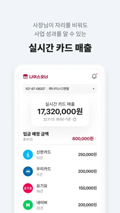 나이스오너는 앱 하나로 매일매일 업데이트 되는 매출, 지출, 정산 금액 및 계좌내역을 손쉽게 확인할 수 있습니다. 사장님 장부 관리에 필요한 다양한 정보를 한눈에 파악하세요!