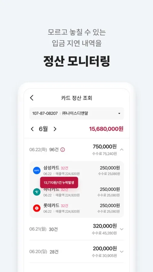 사장님 가게 매출이 누락 없이 정상적으로 입금되고 있는지 매일 확인해 드려요