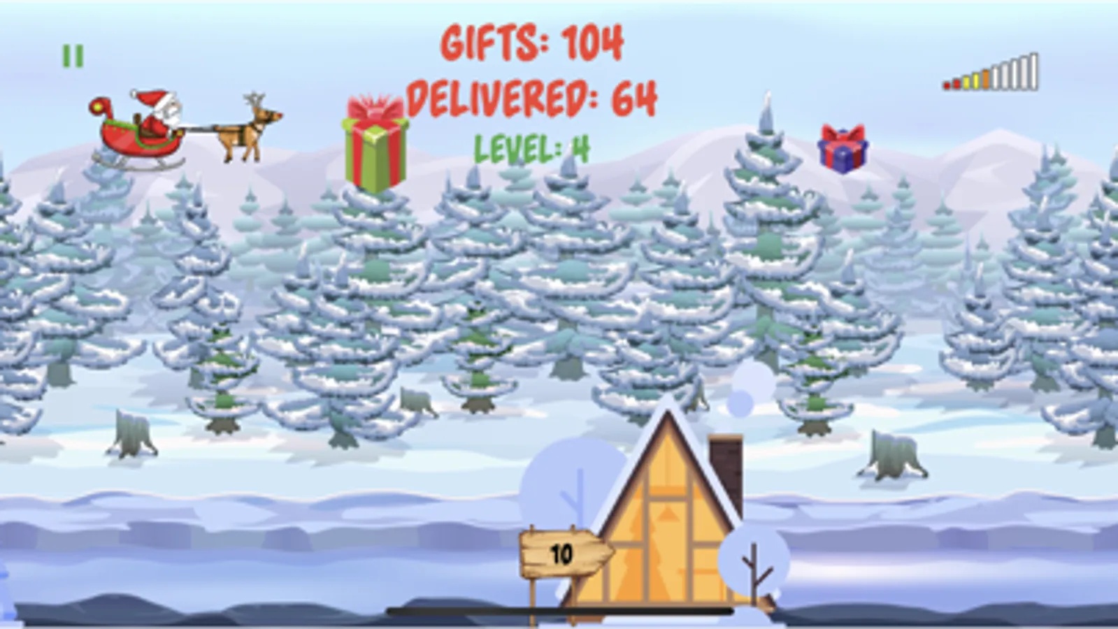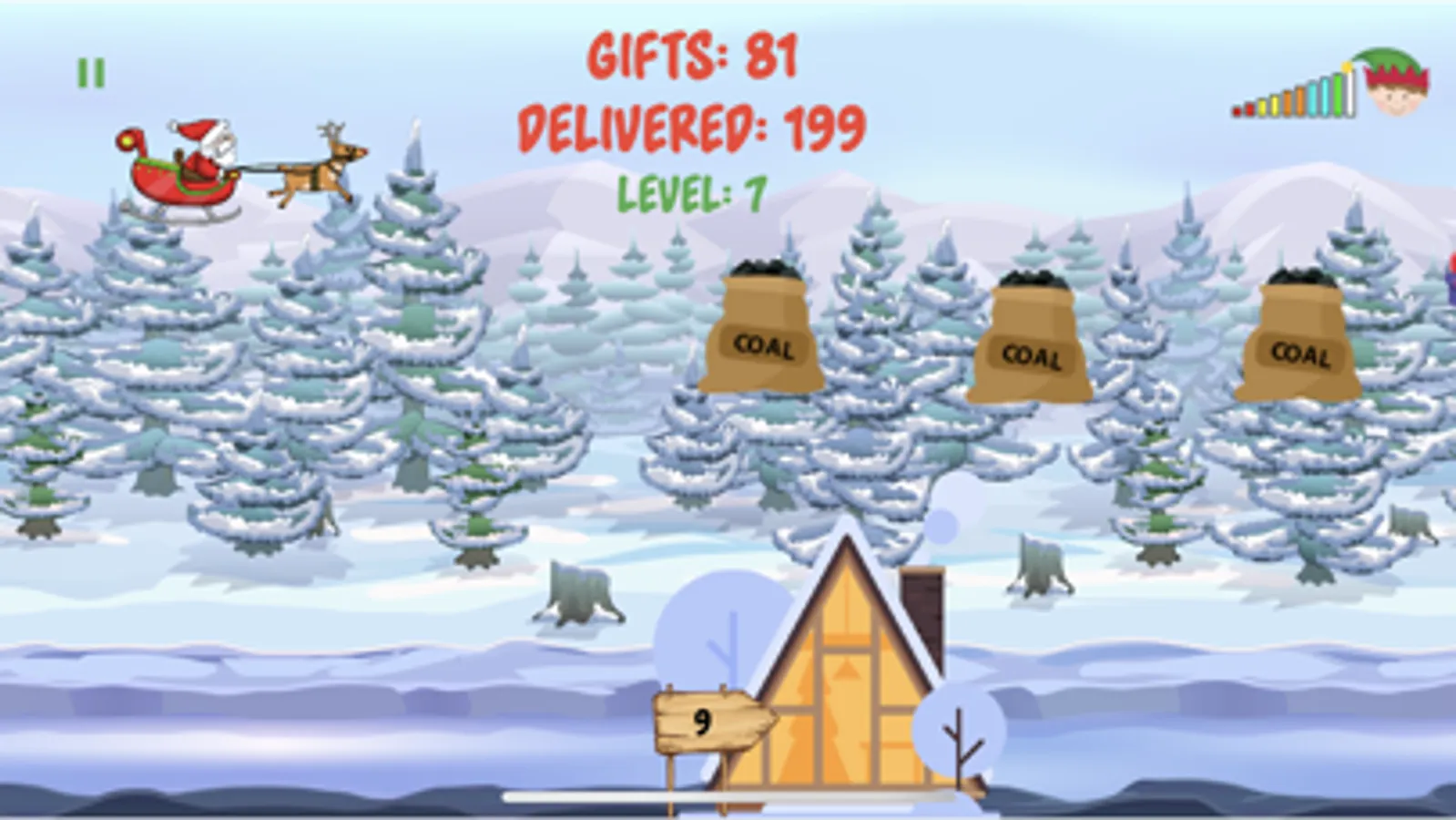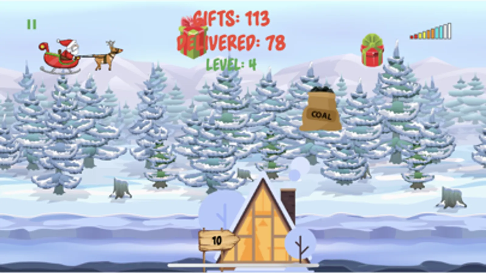 Fly Santa and his sleigh to collect presents and deliver them to the houses. See how many presents you are able to deliver before you run out of presents or miss too many houses or gifts. Get the happiness meter to full to move on to the next level.