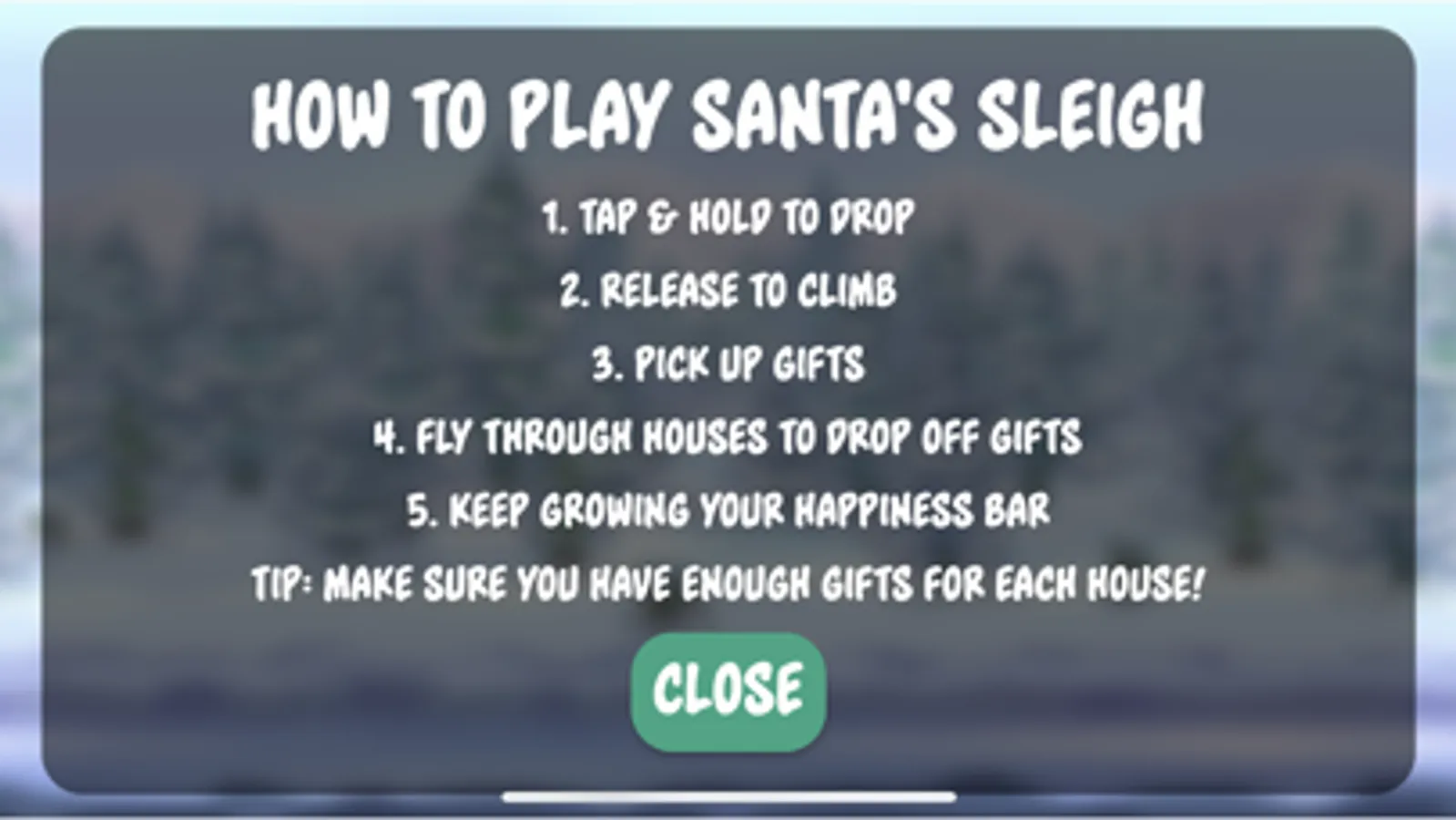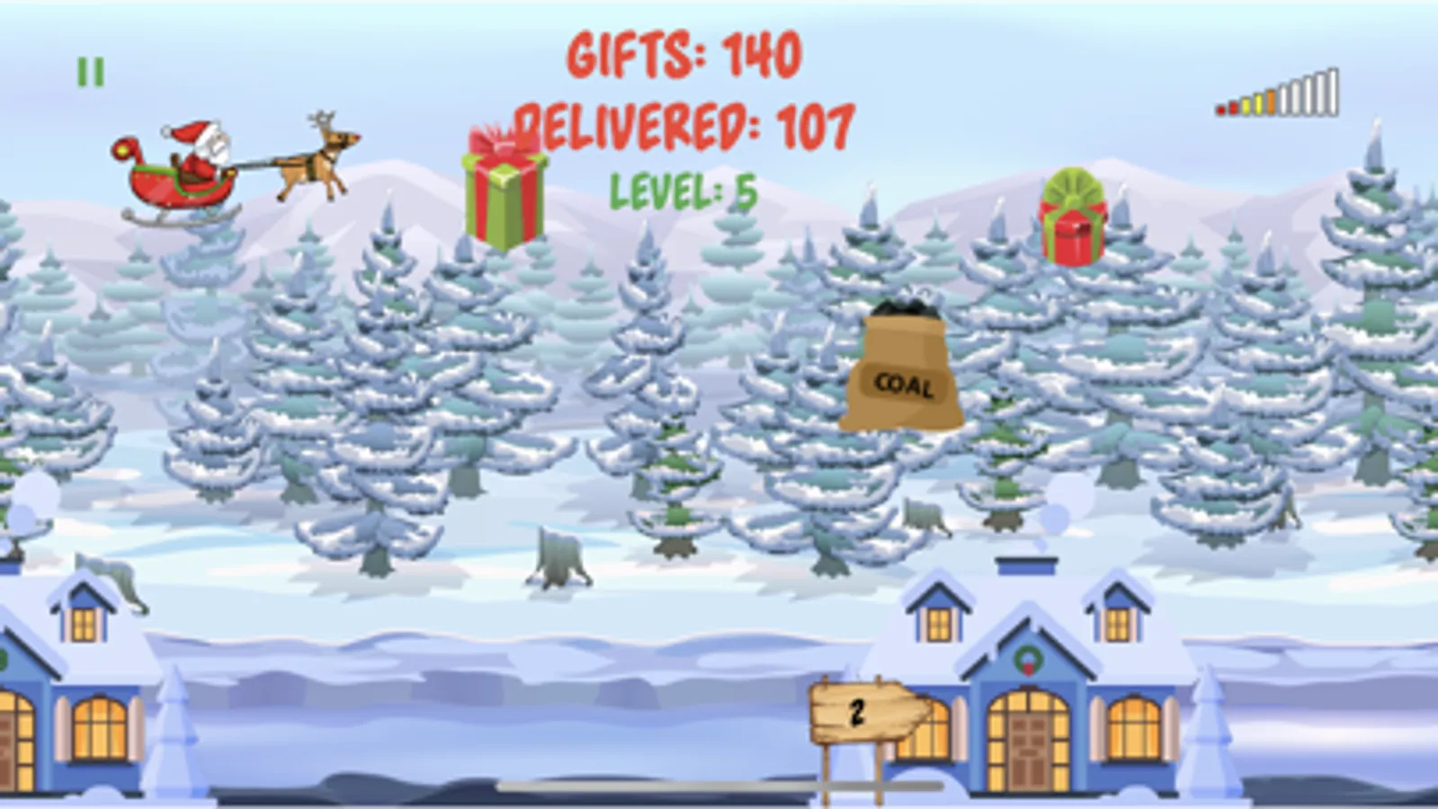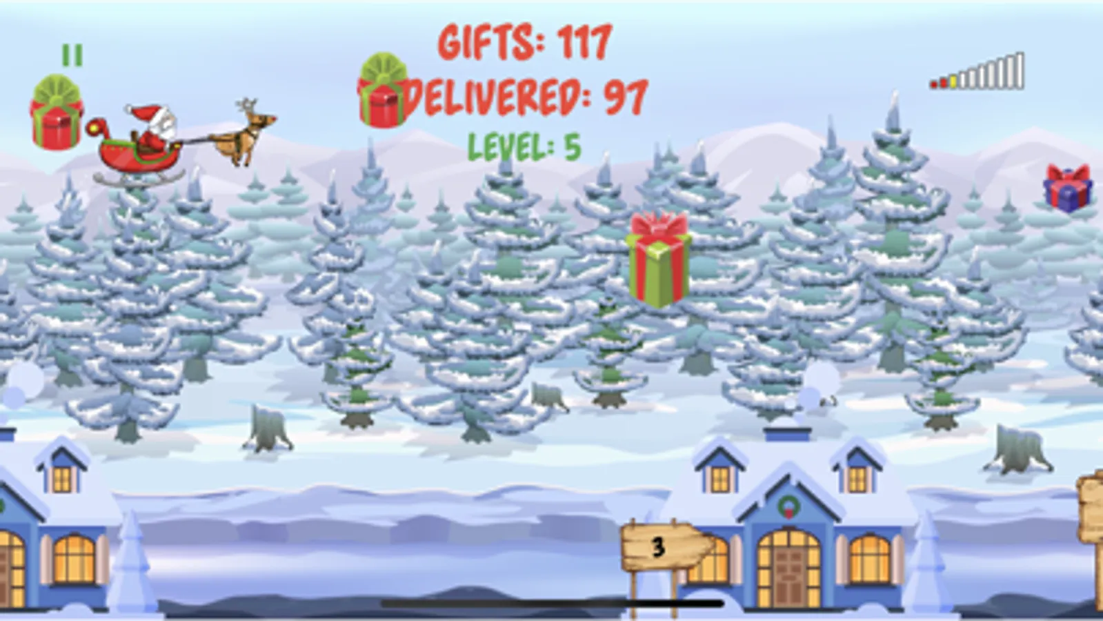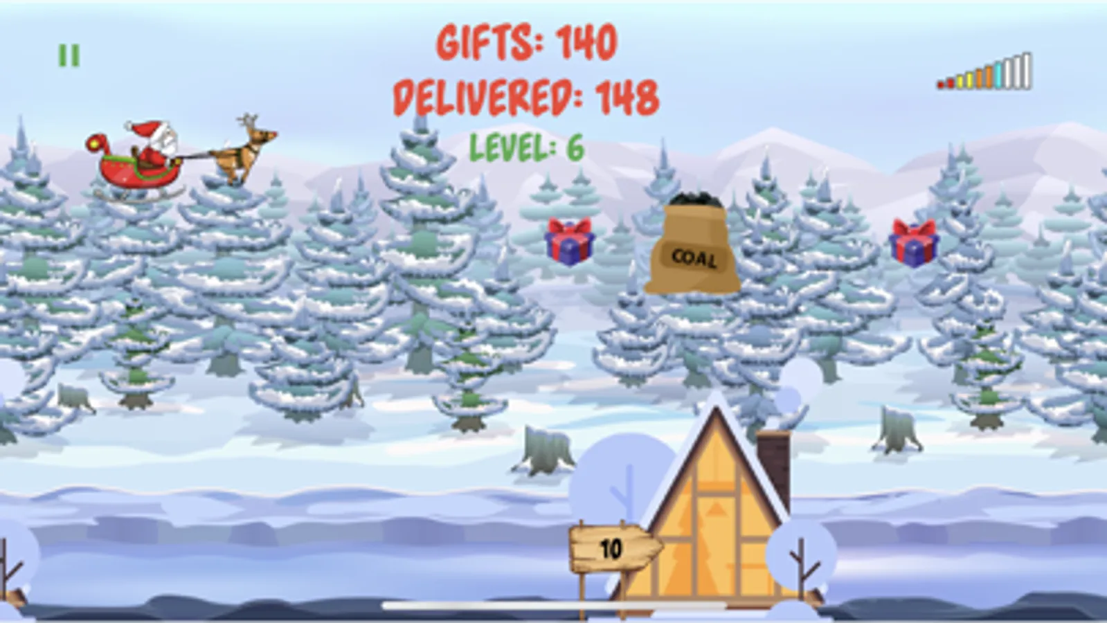 Fly Santa and his sleigh to collect presents and deliver them to the houses. See how many presents you are able to deliver before you run out of presents or miss too many houses or gifts. Get the happiness meter to full to move on to the next level.