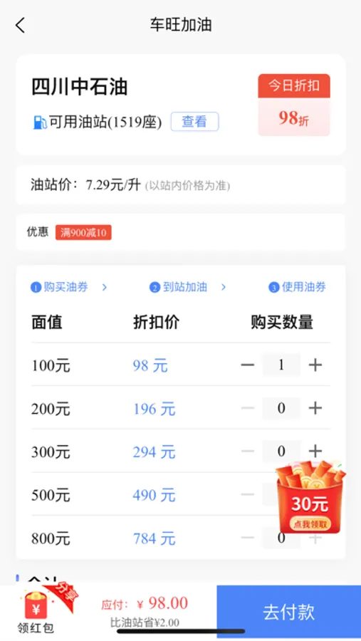 「车旺加油」大额券包超值购,加油单单有优惠。油站位置、周边油价一目了然,一键导航省时省心。