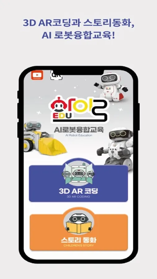 아이로AR 어플리케이션은 스마트 기기를 활용해 원에서 배운 내용을 가정에서도 학습할 수 있도록 3D AR 코딩, 스토리동화 2가지로 구성되어 있습니다.