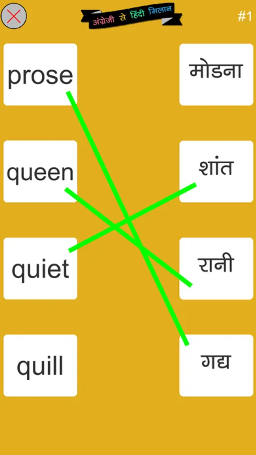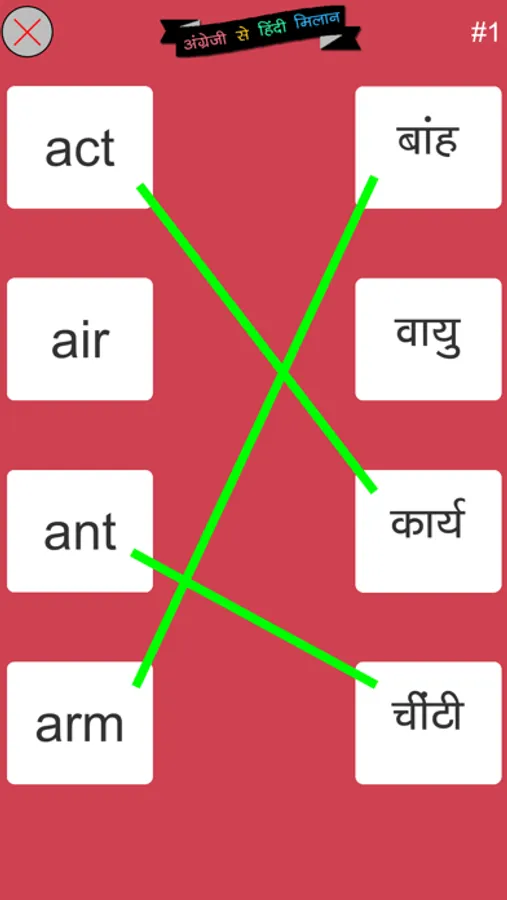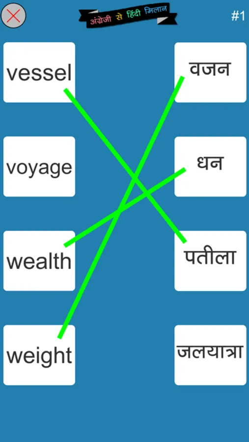 Draw Lines: You'll use your finger to draw lines connecting English words to their corresponding Hindi meanings.