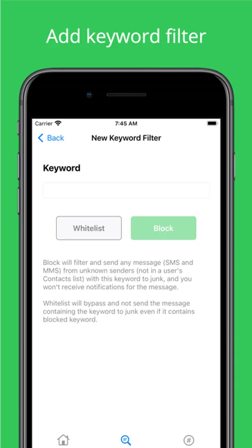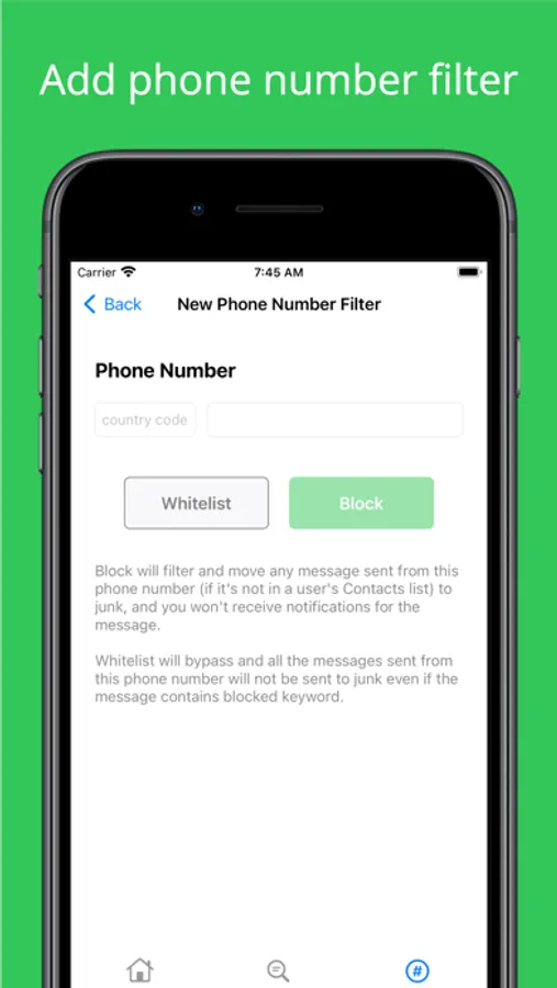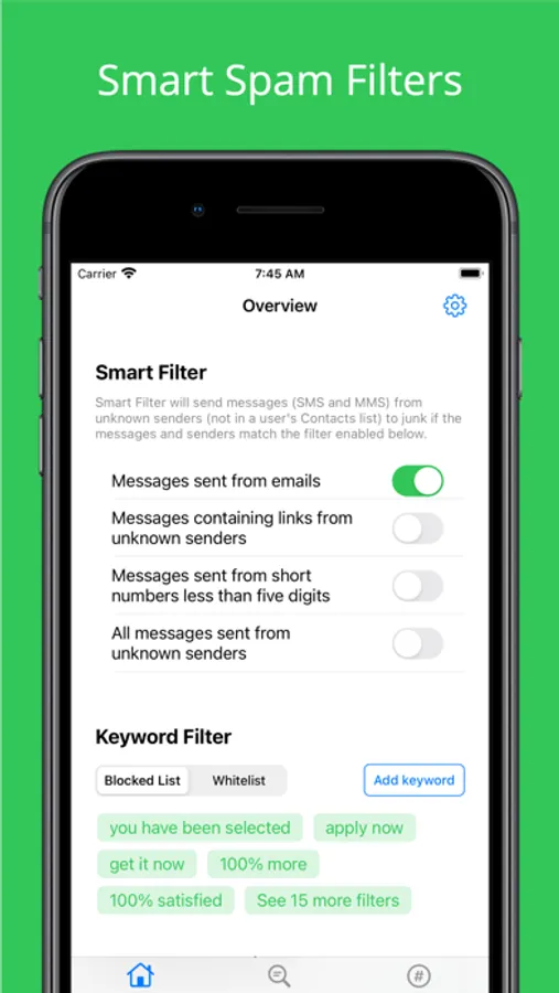 * Smart Filters - multiple smart filters to filter out spam SMS(text messages) and block from receiving these directly after enabling the filters including: