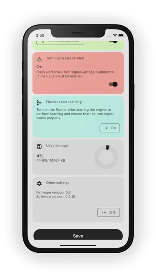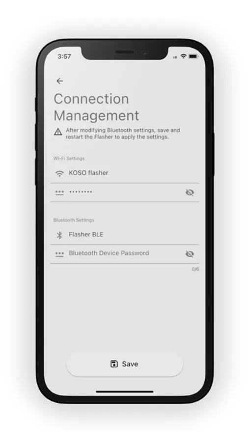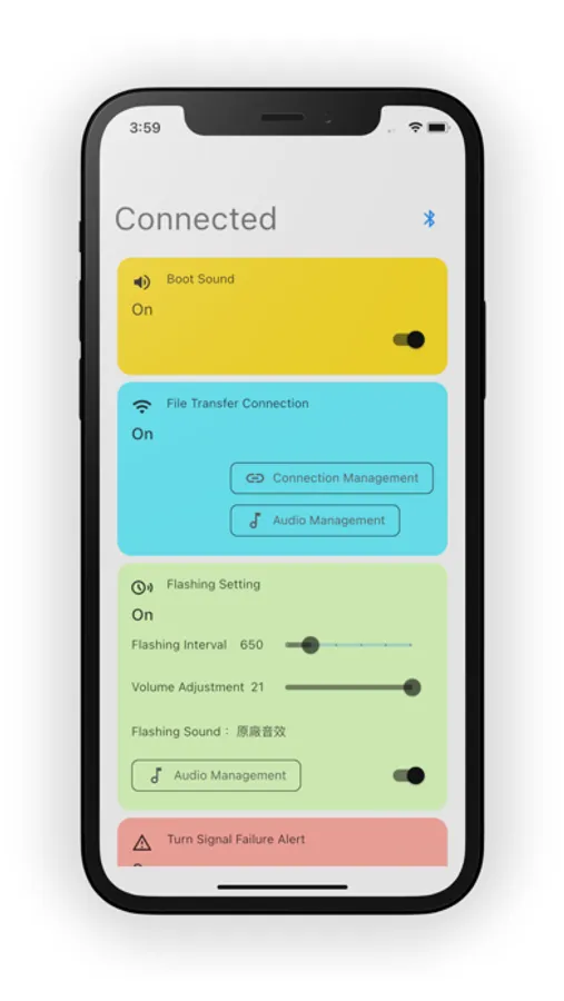 KOSO Flasher is a tool used through a mobile app to adjust KOSO's motorcycle turn signals. It connects via Bluetooth and is used to adjust the turn signal flashing frequency, interval, flashing sound effects, and volume. By connecting to the device's network, you can also upload custom sound files to use as flashing sound effects.