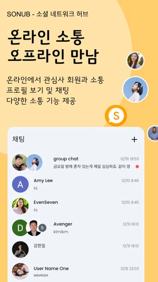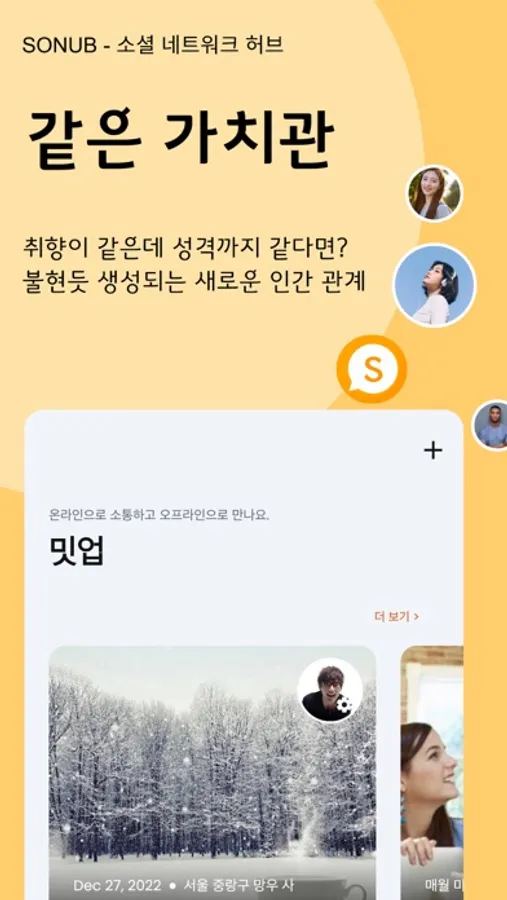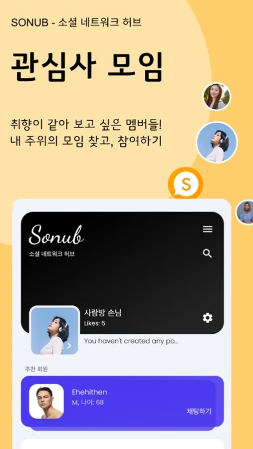 소너브는 친목 교류와 공유를 지향하는 관심사 기반의 모임 앱입니다.